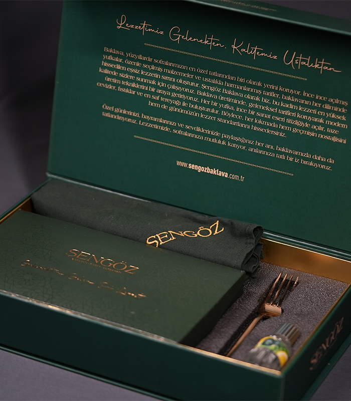 Şengöz Baklava’nın özel tasarlanmış VIP Kutusu, sevdiklerinize unutulmaz bir tatlı deneyimi sunmak için hazırlandı. İçinde özenle seçilmiş baklavalar, çatal ve mendil seti, ayrıca ferah kolonya ile birlikte gelir.